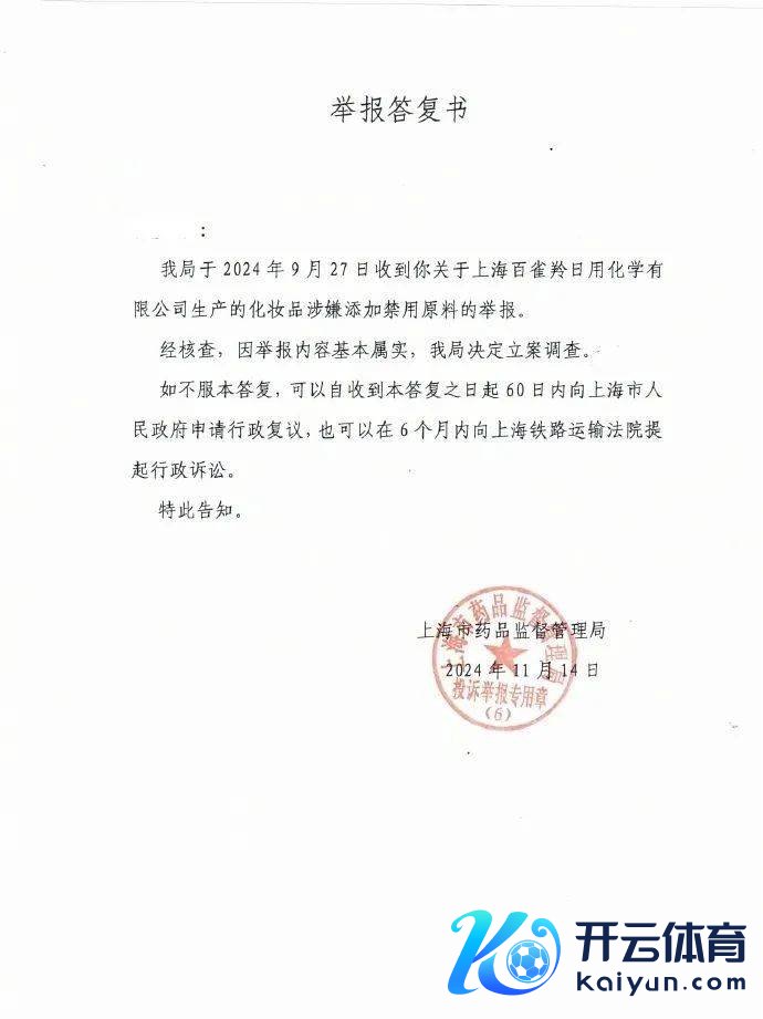 我局于2024年9月27日收到你对于上海百雀羚日用化学有限公司坐褥的化妆品涉嫌添加禁用原料的举报。