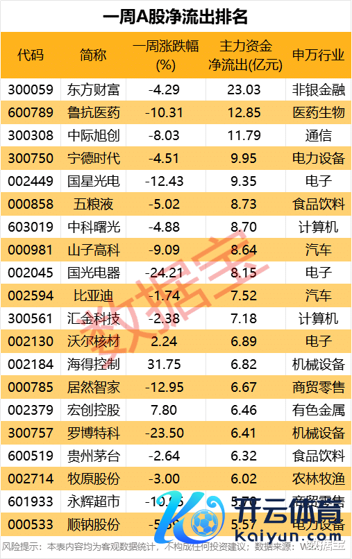 净流出方面,本周24股主力资金净流出在5亿元以上。东方钞票、鲁抗医药、中际旭创净流出额前三,金额轮番为23.03亿元、12.85亿元、11.79亿元。 行业上,白酒股贵州茅台、五粮液上榜,净流出额区分为6.32亿元、8.73亿元。星河证券合计,2025年酒企营销使命想法变化不大,倾向于作念深作念实,瞻望行业神色接续呈现分化辘集的发展趋势。现在白酒板块估值仍处于历史偏低位置,且各家酒企纷繁出台中期分成决策、回购决策,板块估值有撑抓。 锂电板想法股遭到主力资金抛售,比亚迪、宁德期间主力资金净流出额轮番为7.52亿元、9.95亿元。