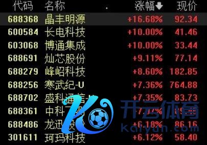 10:03芯片股抓续走强寒武纪涨超7%续创历史新高。 寒武纪涨超7%续创历史新高,晶丰明源涨超16%,长电科技、博通集成涨停,灿芯股份涨超9%,芯原股份、中芯海外、通富微电等跟涨。
