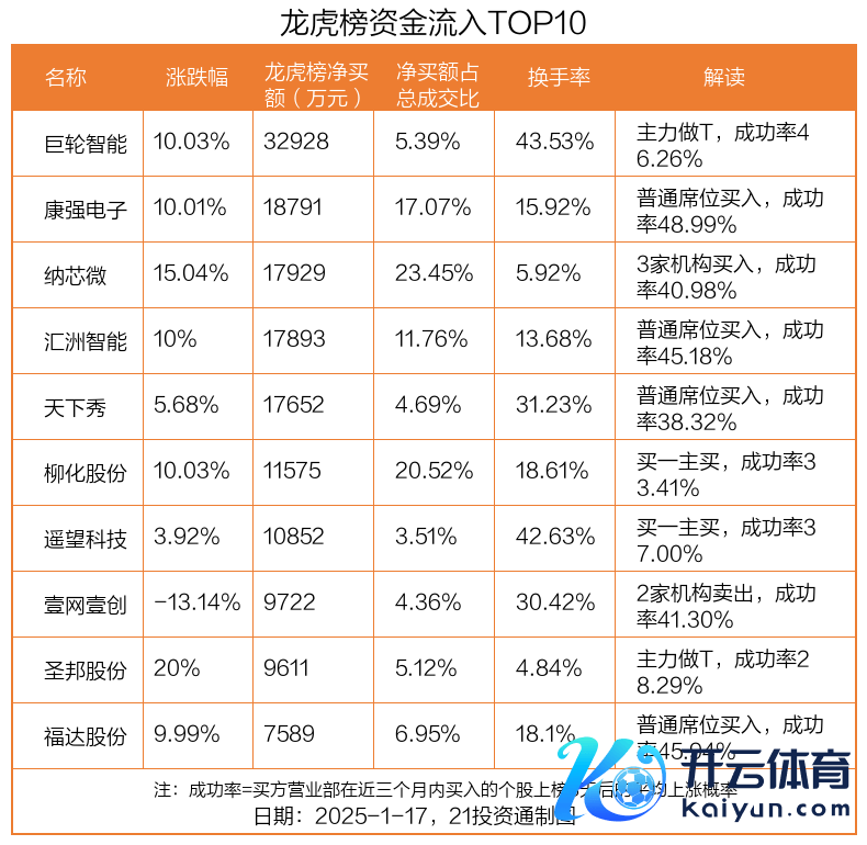 1月17日,上证指数高涨0.18%,深证成指高涨0.6%,创业板指高涨0.78%。盘后龙虎榜数据露出,共有45只个股因当日异动登上龙虎榜,资金净流入最多的是巨轮智能(002031.SZ),达3.29亿元。 据21投资通智能监测,17只个股龙虎榜出现了机构的身影,北向资金参与龙虎榜中的个股共波及13只。 3.29亿元资金抢筹巨轮智能,1.12亿元资金出逃康盛股份45只上榜的龙虎榜个股中,27只个股被净买入,18只个股被净卖出。其中,资金净买入最多的是巨轮智能,达3.29亿元,占总成交金额的5.39%。巨轮智能当日收盘高涨10.03%,换手率为43.53%。