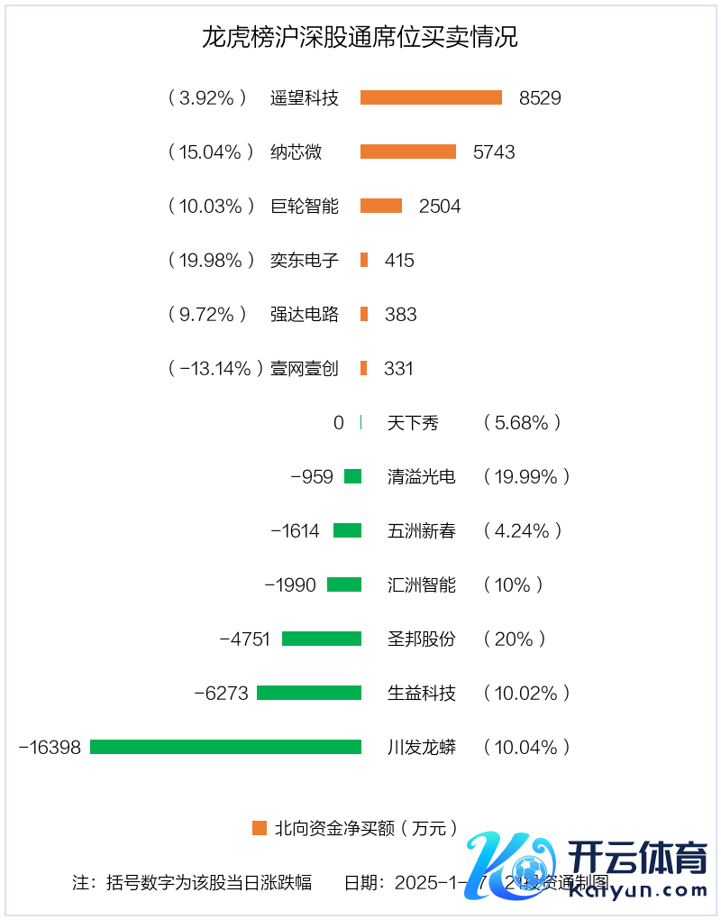 机构净卖出的个股中,金额最多的是圣邦股份(300661.SZ),当日收盘高涨20%,换手率为4.84%。 北向资金净买入7股,净卖出6股1月17日,北向资金参与龙虎榜中的个股共有13只,统统净卖出1.41亿元。其中沪股通净买入2 股,净卖出3 股,统统净卖出3102.64万元;深股通净买入5 股,净卖出3 股,统统净卖出1.1亿元。 北向资金净买入金额最多的是纵眺科技(002291.SZ),净买入8528.8万元,占总成交金额的2.76%。净卖出金额最多的是川发龙蟒(002312.SZ),为1.64亿元,占总成交金额的6.17%,当日收盘高涨10.04%,换手率为10.75%。