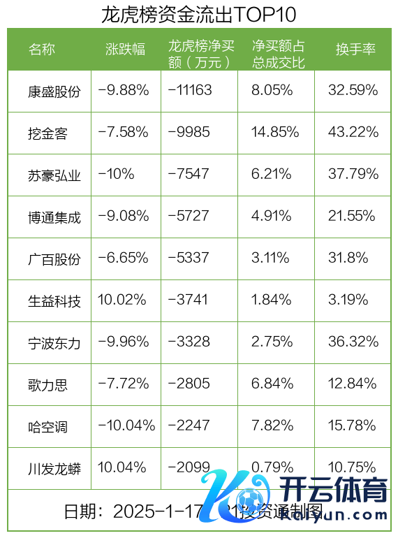 而龙虎榜中资金净流出最多的是康盛股份(002418.SZ),被净卖出为1.12亿元,占总成交金额的8.05%。康盛股份收盘下降9.88%,换手率为32.59%。