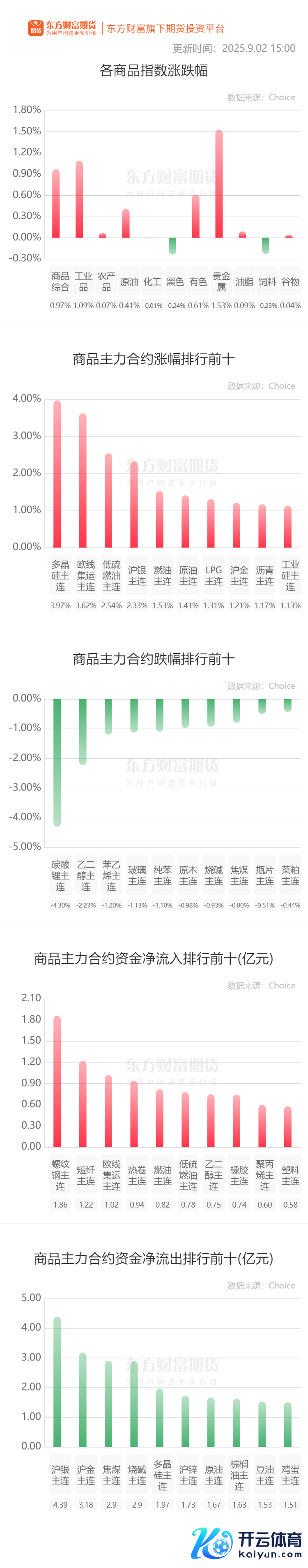 行情纵览 宏不雅产经财联社:近期,越来越多的市集东谈主士大概已开动贯注到:寰球债券市集正堕入逆境……德债、法债、英债、日债在上月无一例外均遭受了“玄色八月”。从好意思国到日本、法国到英国,列国长期政府债券收益率皆在上升,而金融市集也正随之也步入一个新鲜的、愈加危急的期间。 财联社:央行本日开展2557亿元7天逆回购操作,投标量2557亿元,中标量2557亿元,操作利率为1.40%,与此前握平。 品种资讯玄色系期货 铁矿石:卫星数据确认,2025年8月25日-8月31日历间,澳大利亚、巴西七个主要口岸铁矿石库存总量1248.7万吨,环比上升48.2万吨,库存量虽小幅回升,但仍处于三季度以来的较低水平。(我的钢铁网) 钢材:Mysteel追踪调研唐山高炉月底停限产实践情况:按捺9月1日,23家样本钢企89座高炉,钢厂均已按照打算对高炉进行停产测验,新增16座高炉测验;9月1日,沙钢出台9月上旬出厂价,螺纹钢、线材、盘螺价钱握平,现螺纹钢3550元/吨,盘螺3710元/吨;9月1日,中天钢铁出台9月上旬价钱,螺纹钢、线材、盘螺价钱握平。华东螺纹钢3400元/吨、线材盘螺3600元/吨。(我的钢铁网) 焦煤:9月2日晋中平遥地区煤矿安排9月2日晚间到9月3日停产,展望9月4日复产。据调研停产煤矿5座,推断遒劲产能330万吨,按照最新调研口径影响原煤日产0.95万吨,触及煤种为低硫主焦煤和中硫瘦煤。(我的钢铁网) 农居品期货 生猪:据农业农村部监测,按捺9月2日14:00时,寰球农居品批发市集猪肉平均价钱为19.80元/公斤,较前一日下降1.0%;鸡蛋平均价钱为7.59元/公斤,较前一日下降2.1%。(新华财经) 棕榈油:据马来西亚沉寂查验机构AmSpec,马来西亚8月1日-31日棕榈油出口量为1341990吨,较前一月同时出口的1163216吨增多15.37%。(新华财经) 鸡蛋:据对寰球500个县集贸市集和网罗点的监测,8月第4周(网罗日为8月28日),寰球鸡蛋平均价钱8.87元/公斤,比前一周高潮0.2%,同比下落22.8%。(农业农村部) 有色/贵金属期货 沪金:行情数据确认,周二亚洲早盘,现货黄金价钱一举攻克了3500好意思元大关,刷新每盎司3508.73好意思元的历史高点,跳跃了4月份创下的前高点。本年迄今为止,海外金价已累计高潮逾33%,成为发扬最好的大批商品之一。(财联社) 沪铜:本日广东库存赓续增多,到货较多消耗疲软是主因。铜价握续走上下贱采购积极性并不高,但握货商也不肯降价出货,生意两边处于相握阶段,全体交投并不活跃。本日广东地区电解铜采购情谊为1.89较上一来回日下降0.09,出货情谊为3.00较上一来回日上升0.03。(上海有色网) 沪铅:2025年8月寰球电解铅产量小幅上升,环比上升0.32个百分点,较客岁同时上升2.92个百分点。2025年1-8月电解铅累计产量同比上升8.23个百分点。据了解,8月份,华中、华北和华东等地区中大型电解铅冶真金不怕火企业测验后迟缓规复,全体供应预期增量。(上海有色网) 能化期货 LPG:昨日华南LPG市集稳中带跌,9月入口资本上升的利好已被市集提前消化,由于船埠连接到船出货压力增大,且需求未见瓦解好转尤其对高位叛逆,展望本日市集稳中偏弱,高位价钱仍面对下行压力。(隆众资讯) 橡胶:由于泰国改日2-7天出现大雨天气,激流风险上升,橡胶价钱容易朝上波动。多空汇报不同的故事。涨因季节性预期、需求预期看多,跌因需求偏弱。(自然橡胶网) 晚间存眷无开云体育 |